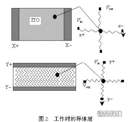 触摸液晶显示屏在工作的时候,上下的导体层相当于电阻网络,看图2所示。当某一层的电极加上电压的时候,会在这个网络上形成电压梯度。假如有外力使得上下两层在某一个点接触,则在电极未加电压的另外一层可以测得接触点上的电压,从而得知接触点上的坐标。如果在顶层的电极加上电压,则顶层导体层上会形成电压梯度,如果有外力使得上下两层在某一个点接触,在底层就可以测出接触点处的电压,再依据该电压与电极之间的距离关系,知道这里的X坐标。然后把电压切换到底层电极上,并且在顶层测量接触点处的电压,从而知道Y坐标。